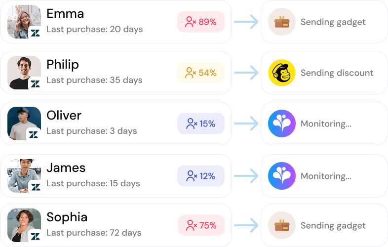Gracias a la predicción del abandono, puedes monitorizar cómo evoluciona el riesgo de abandono de cada cliente a lo largo del tiempo y activar customer journey personalizados para prevenirlo.